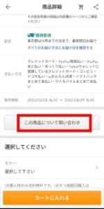 ショップへお問い合わせするには、まず、商品ページを開き、この商品についてお問い合わせをタップします。