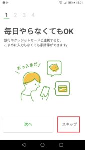 ダウンロード後、上のようにZaimの特徴などを説明した画面が表示されるので「スキップ」をタップします。