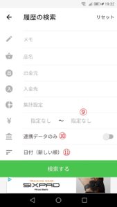 ⑩連携データのみ:自分で入力したものでなく、連携済みの銀行・クレジットカードなどで絞り込む