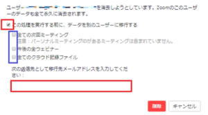 ミーティング、ウェビナー、クラウド記録を他のユーザーに移行したい場合は「この処理を実行する前にデータを別のユーザーに移行する」にチェックを入れてください。