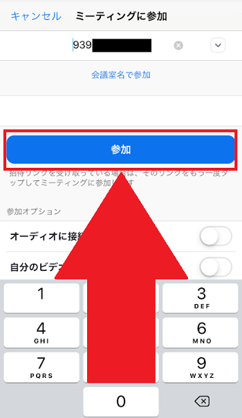 招待URLはミーティングIDに変換されます。参加を選んでタップします。