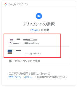 Googleアカウントが表示されるので、Zoomと連携したいアカウントをクリック。