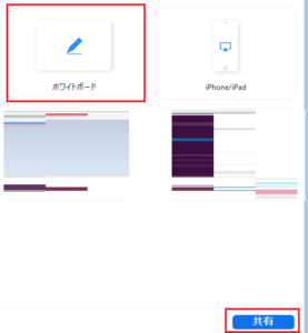 画面共有したい画面が表示されるので、その中から「ホワイトボード」をクリックして、右下の「共有」をクリック。