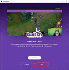 「Launch Snap Camera」にチェックを入れて「Finish」をクリックしてください。